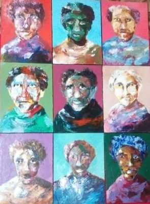 The name of the work is Faces from Real Life. The size of the work is 210*150 The work consists of nine pieces, all of which are displayed next to each other without any spaces The material used is oil on canvas
