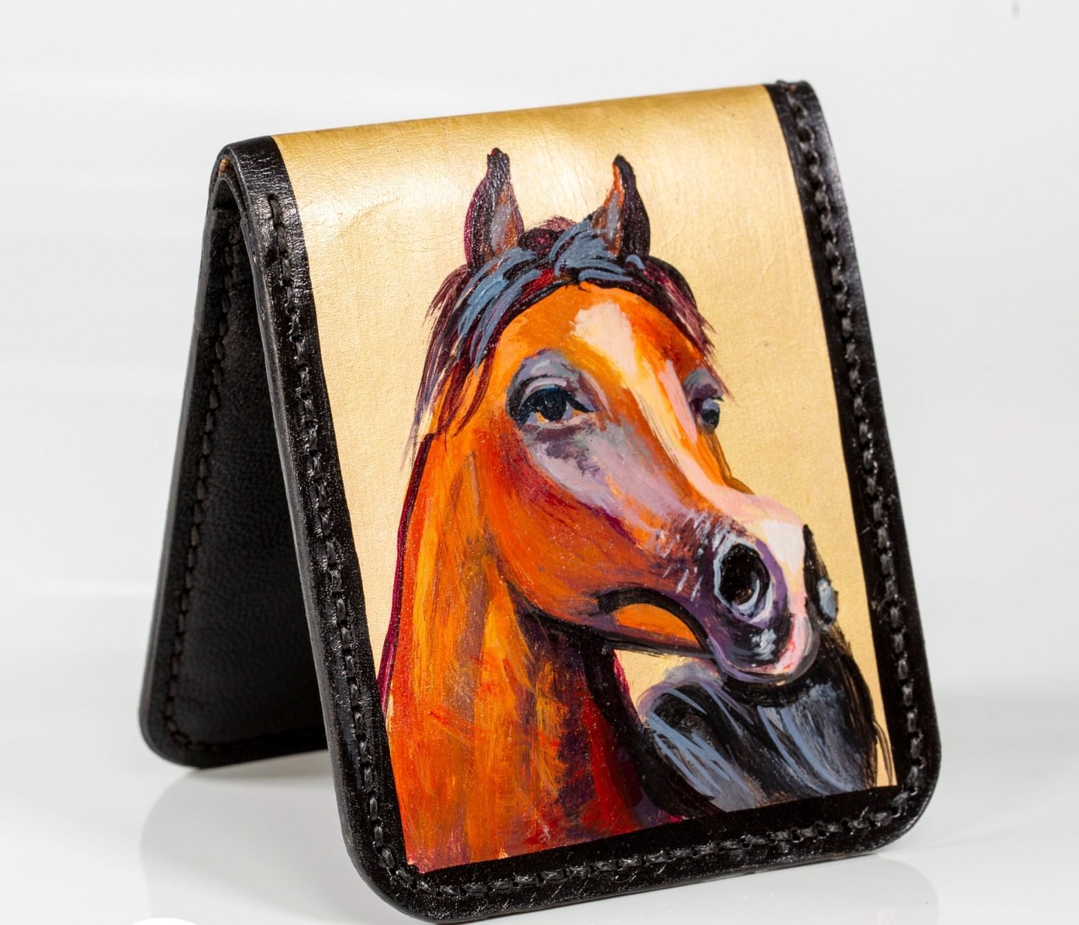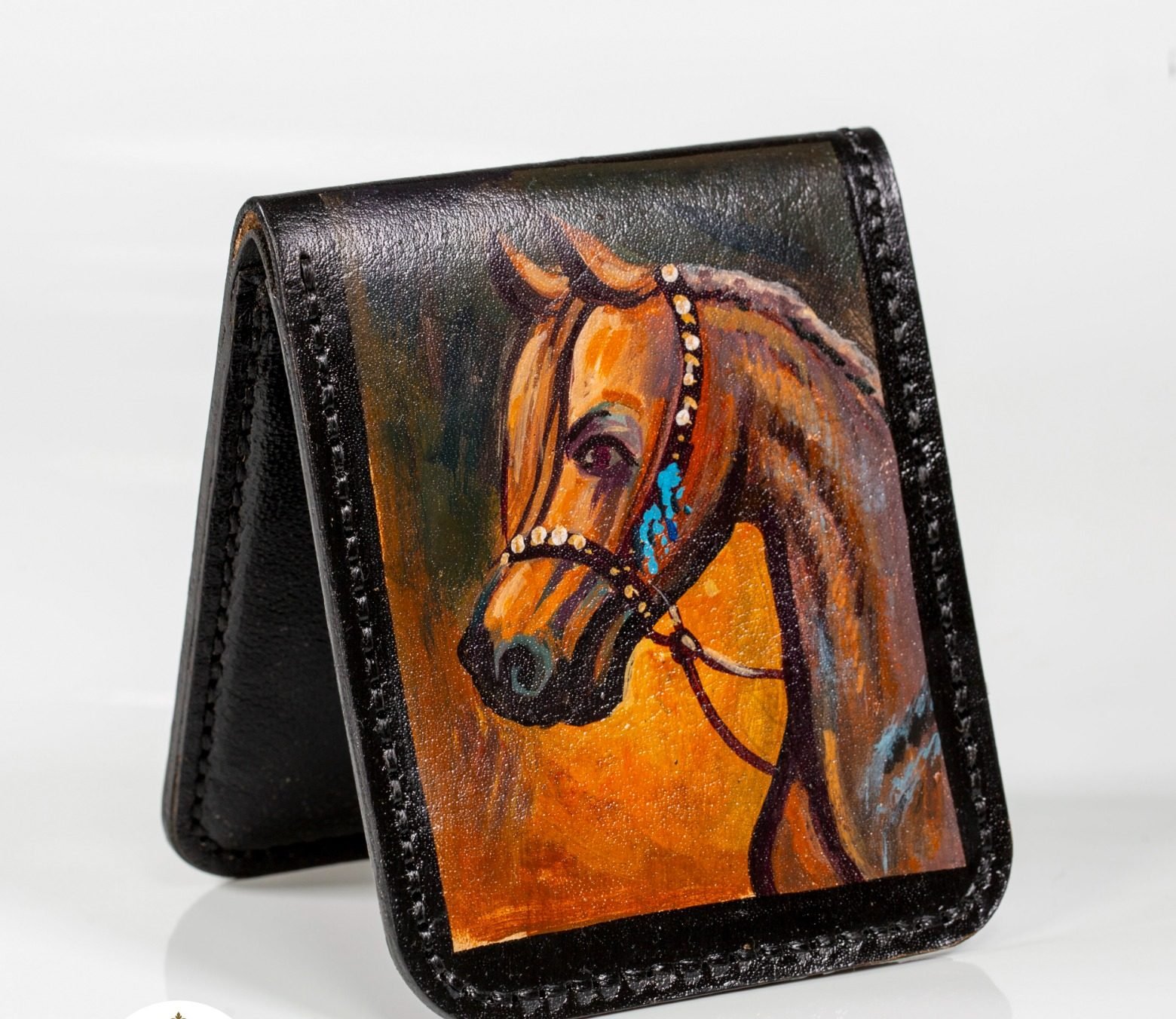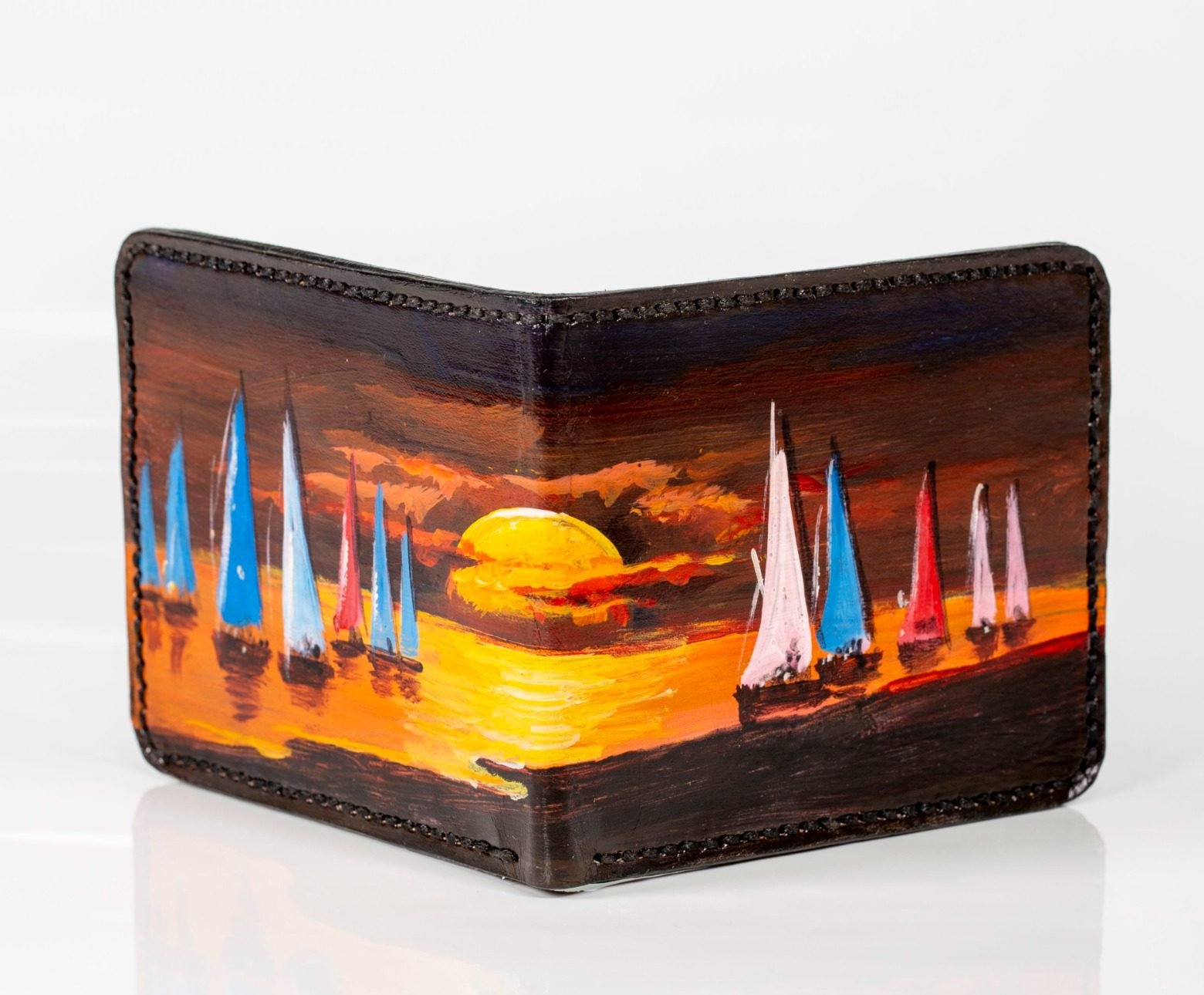 Painting on a wallet made of pure genuine leather, both inside and outside, hand-drawn and hand-stitched, dimensions 22.5 cm by 9 cm