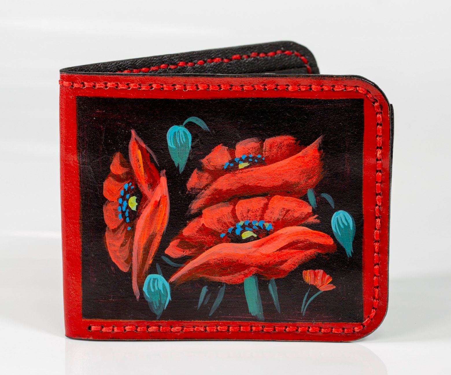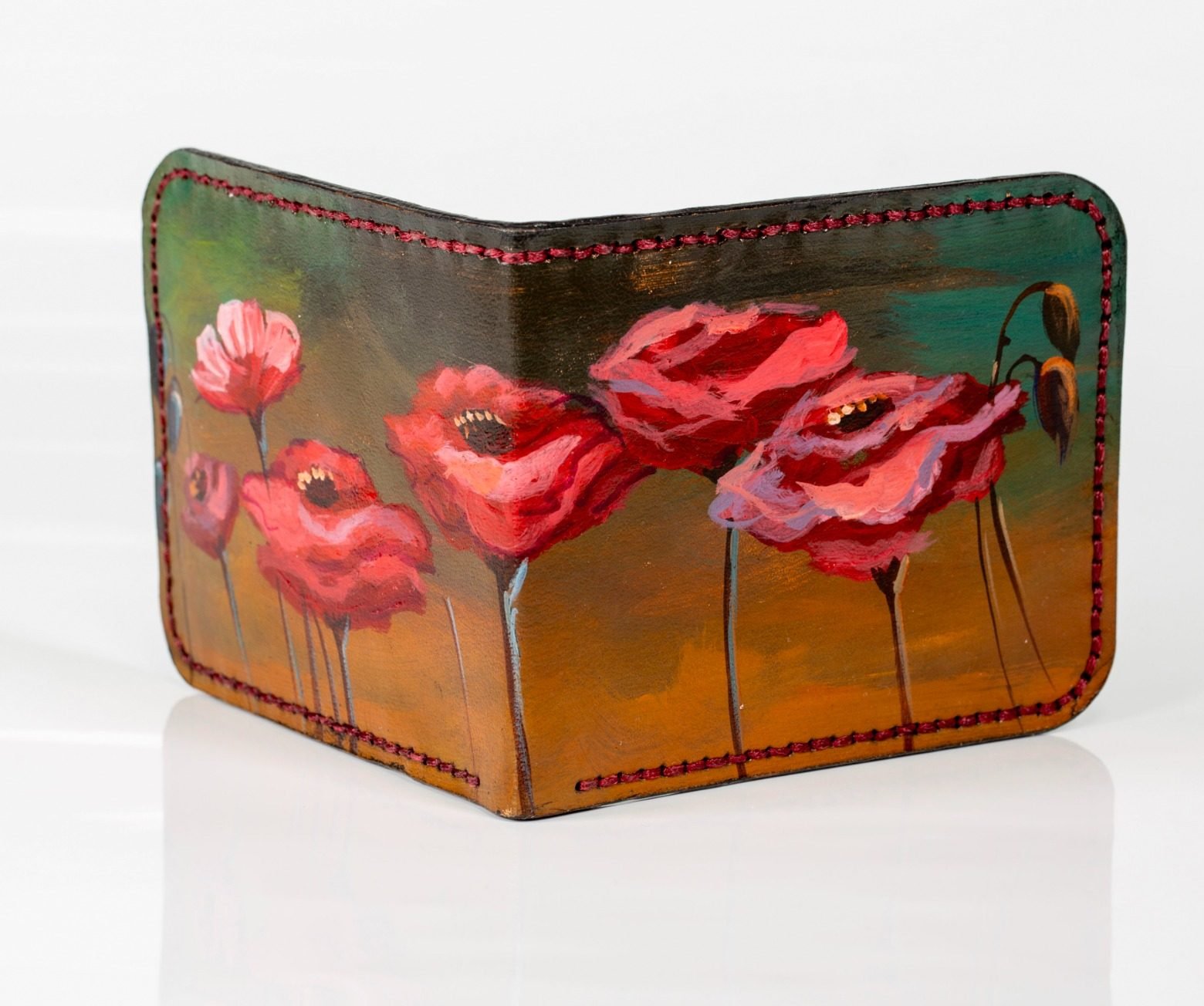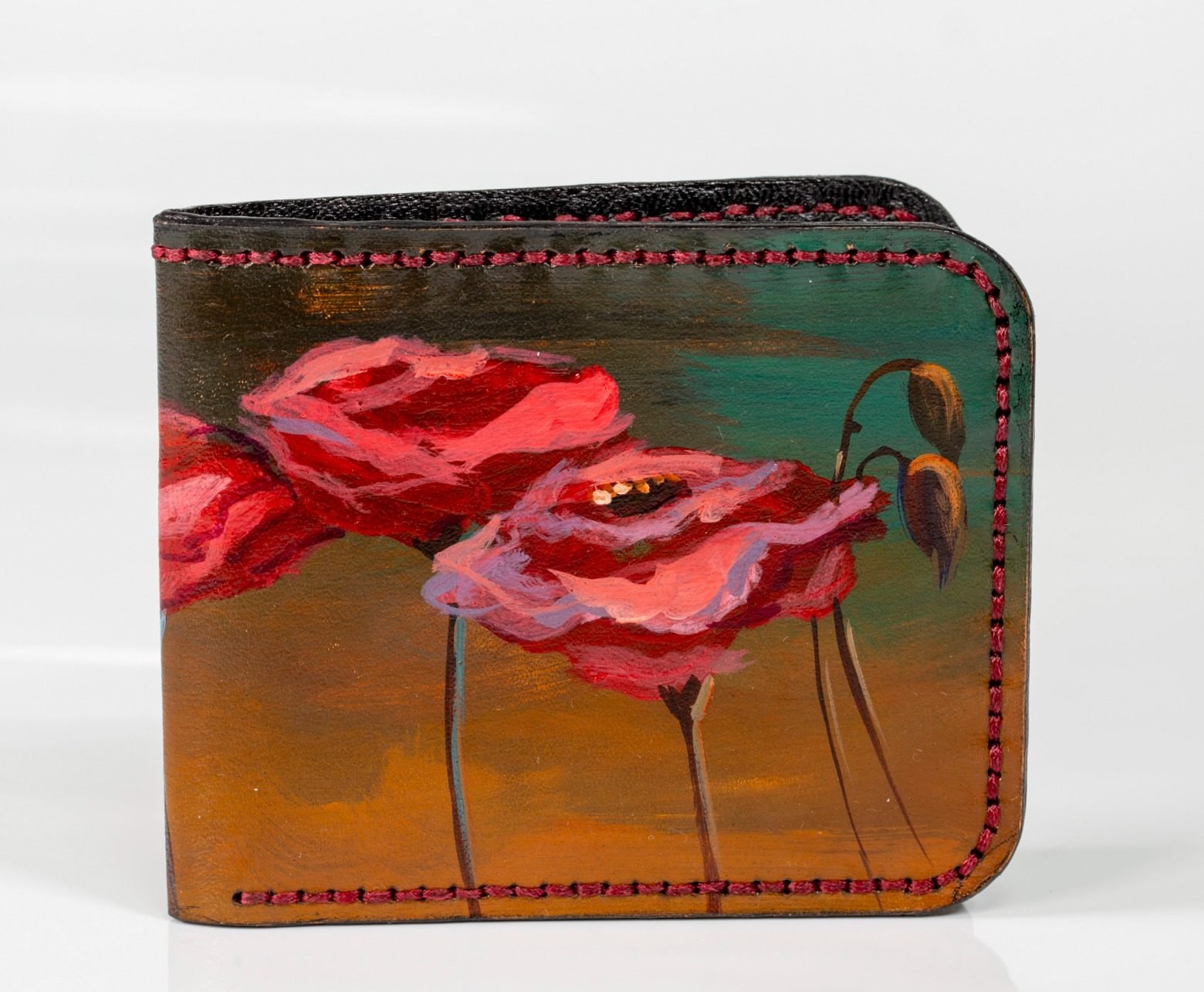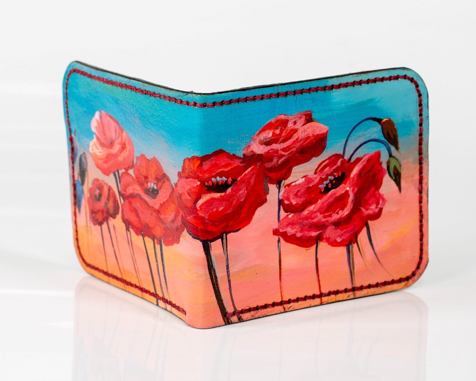 Painting on a wallet made of pure genuine leather, both inside and outside, hand-drawn and hand-stitched, dimensions 22.5 cm by 9 cm